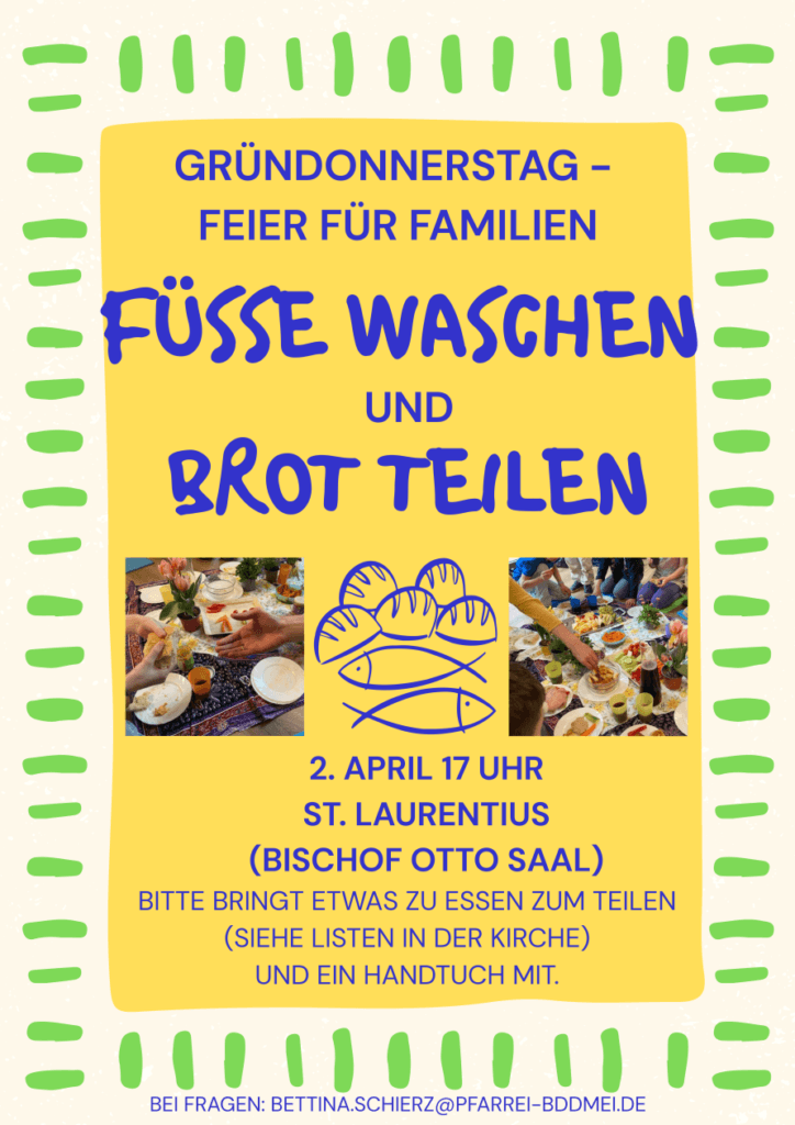 Gründonnerstag Feier für Familien 24.03.2026 24.03.2026 Bei Fragen: bettina.schierz@pfarrei-bddmei.de